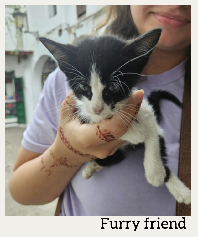 Now, it is open for everyone to visit, and people of many religious backgrounds—Muslim, Jewish, Christian, etc.—live there in harmony. As we toured the streets, we got to experience the bustling markets and visit the historic mosques as we learned more about Islam and Moroccan culture. What was particularly interesting was learning to haggle in the markets. In the US and Spain, items and crafts are listed for one set price. However, in Morocco, almost everything is up for negotiation. It felt a little scary at first, but once we got the hang of it, it was like playing a game with every seller on the street. It was a lot of fun! As in Spain, food is a wonderful way of connecting with the people and culture in Morocco. With many dishes unique to the country, dishes such as couscous, chicken tahine, and Moroccan salad offer a vibrant fusion of flavors, blending Arab, Berber, Mediterranean, and French influences. Spices such as saffron, cumin, and cinnamon are commonly found in the food. Lastly, it’s difficult to experience Morocco without engaging with its furry residents who add charm to the cityscape—the cats! Stray cats can be found lounging everywhere in the markets (often on the merchandise!) and bounding down the roads and stairs of the medina. The cats are part of the local population, are often well cared for by locals even if they aren’t officially pets, and are seen as symbols of good luck.