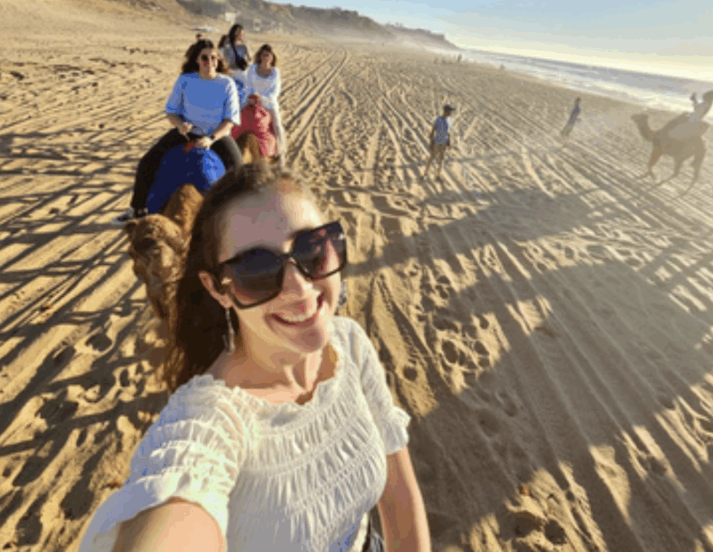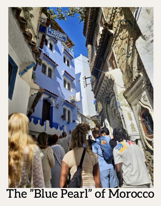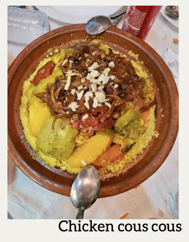 Now, it is open for everyone to visit, and people of many religious backgrounds—Muslim, Jewish, Christian, etc.—live there in harmony. As we toured the streets, we got to experience the bustling markets and visit the historic mosques as we learned more about Islam and Moroccan culture. What was particularly interesting was learning to haggle in the markets. In the US and Spain, items and crafts are listed for one set price. However, in Morocco, almost everything is up for negotiation. It felt a little scary at first, but once we got the hang of it, it was like playing a game with every seller on the street. It was a lot of fun! As in Spain, food is a wonderful way of connecting with the people and culture in Morocco. With many dishes unique to the country, dishes such as couscous, chicken tahine, and Moroccan salad offer a vibrant fusion of flavors, blending Arab, Berber, Mediterranean, and French influences. Spices such as saffron, cumin, and cinnamon are commonly found in the food. Lastly, it’s difficult to experience Morocco without engaging with its furry residents who add charm to the cityscape—the cats! Stray cats can be found lounging everywhere in the markets (often on the merchandise!) and bounding down the roads and stairs of the medina. The cats are part of the local population, are often well cared for by locals even if they aren’t officially pets, and are seen as symbols of good luck.